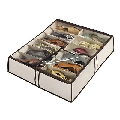 The Whitmor 64703151 12 pockets underbed shoe organizer bag in tan espresso color, holds up to 12 pairs of regular size shoes. It has a clear top for quick and easy view.