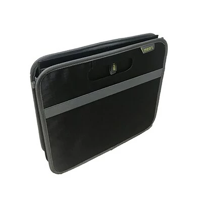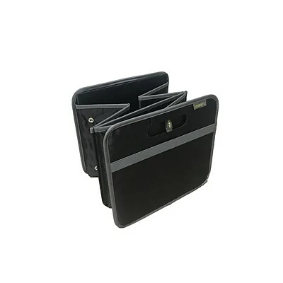 The meori X-large Heavy Duty foldable fabric box is a trunk organizer designed especially for a large portable office, grocery trips, car vacations, and trunk organization. It holds up to 65 lbs. and folds and unfolds in three quick steps. Collapsible and folds flat when not in use. This box features two compartments and two interior mesh pockets. Snaps allow for use of just one compartment and hold the box closed when not in use. Made with extra-tough ripstop fabric. Wipes clean easily with a damp sponge.