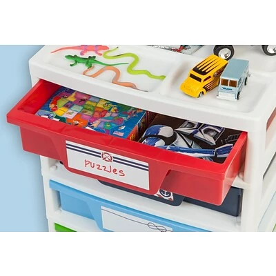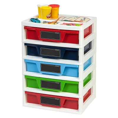 The IRIS® 5-Drawer Boy’s Storage & Organizer Chest (150332) has both function and style. Organize art and activity supplies, puzzles, games, books, and more with this storage set. The chalkboard label on each drawer helps to easily identify contents whi le allowing kids to personalize the chest as well. Keep the most needed items organized with the organizer top so that they are always in reach.