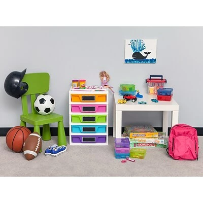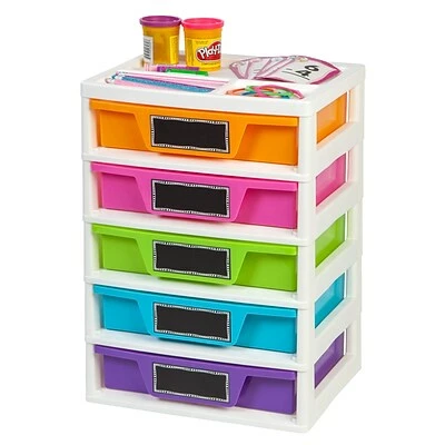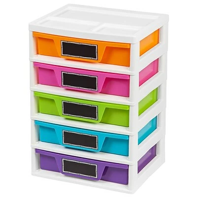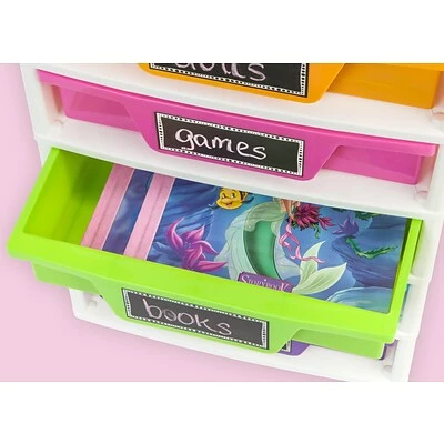 The IRIS® 5-Drawer Girl’s Storage & Organizer Chest (150330) has both function and style. Organize art and activity supplies, puzzles, games, books, and more with this storage set. The chalkboard label on each drawer helps to easily identify contents wh ile allowing kids to personalize the chest as well. Keep the most needed items organized with the organizer top so that they are always in reach.