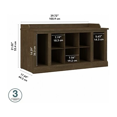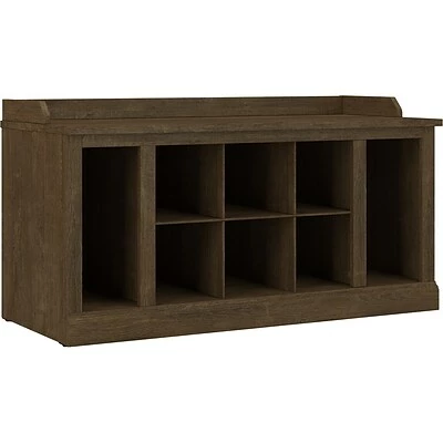 The kathy ireland Home by Bush Furniture Woodland 40″W shoe storage bench with shelves combines transitional styling and a practical design to offer a perfect entryway organizer. Have a seat on the durable bench surface, and take a moment to relax as you get ready to head out the door or come home after a long day. The top of the mudroom bench supports 250 lbs., so you can sit down to put on and take off your shoes or set shopping bags down after a trip to the store with confidence. Six cubby spaces and two vertical shelves keep footwear of all shapes and sizes in order. This shoe bench’s transitional design blends elements of contemporary and traditional styling to complement an array of home furnishings. This entryway bench with storage has been tested to meet Bush Furniture’s standards for safety, performance, and durability and is backed by a 3-year manufacturer limited warranty.