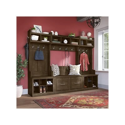 The kathy ireland Home by Bush Furniture Woodland 24″W small shoe bench with shelves combines transitional styling and a practical design to offer a perfect entryway organizer. Have a seat on the durable bench, and take a moment to relax as you get ready to head out the door or come home after a long day. The top of the mudroom bench supports 250 lbs., so you can sit down to put on and take off your shoes or set shopping bags down after a trip to the store with confidence. Six cubby spaces keep your home’s entrance organized while providing easy access to footwear. The storage bench’s transitional design blends elements of contemporary and traditional styling to complement a wide range of home furnishings. This small entryway bench with storage has been tested to meet Bush Furniture’s standards for safety, performance, and durability and is backed by a 3-year manufacturer’s warranty.