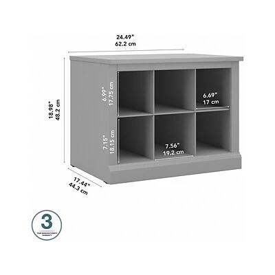 The kathy ireland Home by Bush Furniture Woodland 24″W small shoe bench with shelves combines transitional styling and a practical design to offer a perfect entryway organizer. Have a seat on the durable bench, and take a moment to relax as you get ready to head out the door or come home after a long day. The top of the mudroom bench supports 250 lbs., so you can sit down to put on and take off your shoes or set shopping bags down after a trip to the store with confidence. Six cubby spaces keep your home’s entrance organized while providing easy access to footwear. The storage bench’s transitional design blends elements of contemporary and traditional styling to complement a wide range of home furnishings. This small entryway bench with storage has been tested to meet Bush Furniture’s standards for safety, performance, and durability and is backed by a 3-year manufacturer’s warranty.