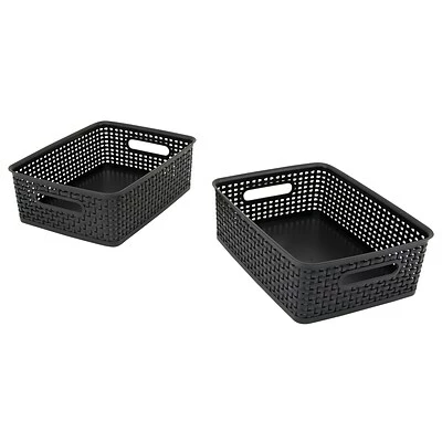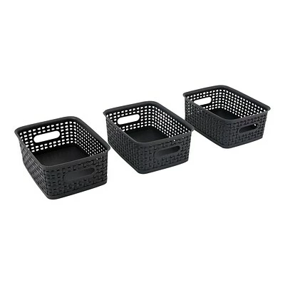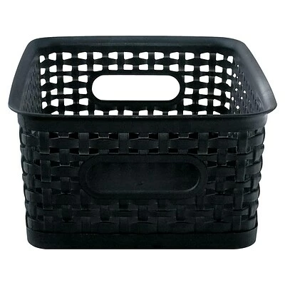Use these woven plastic baskets to sort small items and reduce clutter in homes, daycares, schools, and offices. Each of these durable bins measures 10 x 7.5 x 4 inches and features two sturdy handles, making them easy to rearrange or to carry frequently needed items. These black Advantus storage baskets fit easily onto shelves or in drawers, making them a great choice for organizing and storing everything from office supplies to children’s toys.
