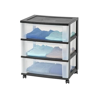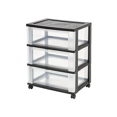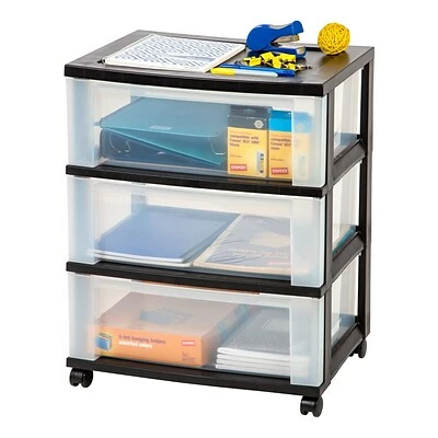 Stash office supplies, personal belongings and other important items with this three-drawer mobile organizer. Four removable rolling casters let you wheel this storage container wherever it’s needed, and the three pullout drawers provide easy access to items stored inside. The sturdy plastic organizer top offers extra space for arranging notebooks, reams of paper and other office essentials. Featuring clear polypropylene construction, this organizer provides a convenient view of the contents stored in the drawers.