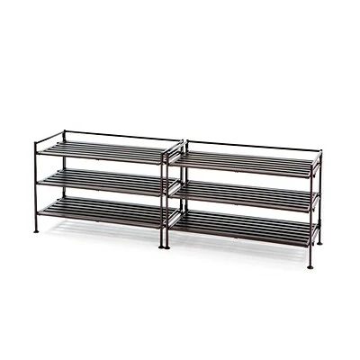 Stay organized with Seville Classics’ 3-Tier Resin Slat Utility Shoe Rack. Shelves hold approximately three pairs of shoes per tier. The shelves feature resin slats with a woodgrain texture and support up to 30 lbs. each. Frame is constructed of iron with an Espresso finish. Snap the shelves into the frame to assemble. Remove shelves and fold away for easy storage. Stack and interlock with multiple units for a personalized storage solution. No tools required for assembly. Pack includes two racks.