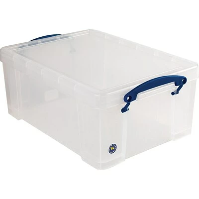 The Really Useful Box® with 9 liter capacity in clear can be recycled. Made with 100 percent polypropylene, these boxes are constructed for durability and have reinforced sides to increase compression strength so boxes maintain their shape. Totally flat bottom increases rigidity for stability and allows for perfect stacking with or without lid. The lockable lid is secured with two latchable handles to protect contents of the box from dust and water splashes. It measures 6-1/4″ x 10-1/4″ x 14-1/2″ and is perfect for letter, legal sized paper