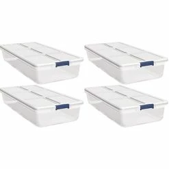 The Hefty Storage Solutions 52-quart latching container is perfect for storing a variety of items throughout the home. The durable double rim reinforces strength. This clear storage container has durable latches for securing the lid contents inside. The unique stacking feature helps take advantage of every inch of storage space.