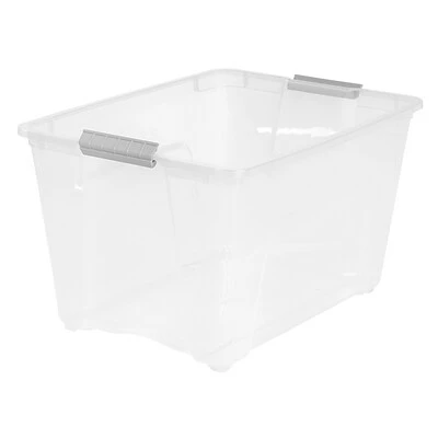 Ensure your items are organized, protected and properly stored with these latch lid storage bins. The clear material allows for easy viewing of contents while the plastic construction provides durability and protection from moisture and other potential damage. These Iris 54-quart Stack & Pull storage bins are designed to create a modular storage system in a house or office.