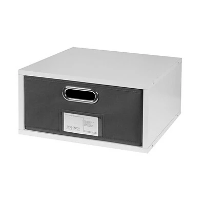 Let your creativity run wild with Cubo! These innovative half size storage cubes by Niche are designed to fasten together in any direction! Connect them in any way you like. In a row, in a pyramid, in a U or L shape, to a full size Cubo storage cube or countless other configurations. Add on to any existing Cubo storage set. Cubes connect to one another with spring pins, making it easy to customize and create a storage system just for you with a single cube to a set of 12 or more. Niche storage cubes are actually square! With interior dimensions of 12 1/8″ x 12 1/8″ x 5 5/8″, they can be used in any direction. There’s no “right” way to use them because all four sides measure the same! Who ever said all cubes had to face the front like a bookcase? Cubo storage cubes can attach together in any direction, which opens up a myriad of new design possibilities. Turn one to the right, turn another to the left. Keep one facing front and still another facing the back. Perfect to clean up clutter in closets, entryways, laundry & storage rooms, as a bookcase, nightstand or media storage, in a classroom or children’s room-these half cubes fit anywhere! Its stylish White Wood Grain finish shows subtle wood grain and is sure to please and coordinates with the rest of the Niche line. No tools LockDowel assembly allows pieces to simply snap together and lock into place for a sturdy, hassle-free build in less than 2 minutes. No more searching for the right size screwdriver or dropping tiny screws. Just snap into place and go. Less hardware and fewer small parts means less plastic packaging and less waste. Add on, arrange and rearrange Niche Foldable Fabric Bins for a fresh, new custom look whenever you like!