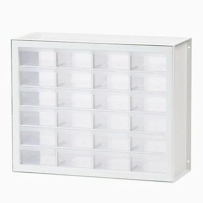 Whether you’ve got beads and buttons or nuts and bolts, the 24 drawer cabinet will help keep you organized. These conveniently sized drawers are great for holding an array of small pieces, and the built in lip at the back means they won’t fall out of the drawered cabinet when opened. Multi-drawer units are optimally designed for stacking or mounting on the wall to maximize storage space. Screw holes on the sides of the 24 drawer storage unit by IRIS mean you don’t have to put screws in the wall in advance, and ribs on the 4 corners keep the stacked drawered parts cabinet from falling over when moved side-to-side, front-to-back, or when opening drawers.