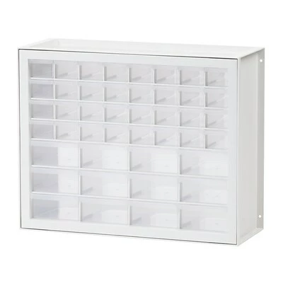 Whether youโve got nuts and bolts or beads and buttons, the 44 drawer cabinet will help keep you organized. These conveniently sized drawers are great for holding an array of small pieces, and the built in lip at the back means they wonโt fall out of the drawered cabinet when opened. Multi-drawer units are optimally designed for stacking or mounting on the wall to maximize storage space. Screw holes on the sides of the 24 drawer storage unit by IRIS mean you donโt have to put screws in the wall in advance, and ribs on the 4 corners keep the stacked drawered parts cabinet from falling over when moved side-to-side, front-to-back, or when opening drawers.