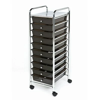 Organize your work and life space today with this multi-purpose Seville Classics 10 Drawer Organizer Cart. This versatile cart is constructed from a sturdy chrome plated steel frame and includes 10 sliding drawers and black casters for added mobility. Each polypropylene drawer has an interior dimension of 9.5โ wide by 13.5โ deep with a depth of 2.6โ leaving plenty of space for the storage of just about anything from papers and documents to crafts and classroom supplies to tools. This useful organizer is ideal for use in the office, kitchen, bathroom, dorm room, classroom, garage or workspace. This handy cart measures 15.3โ D x 12.8โ W x 38.2โ H.